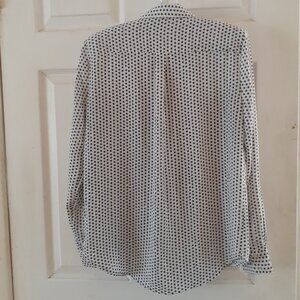Pre-owned Joe Fresh blouse, size medium. The blouse is white, with decorative small black stars. Great condition. The blouse is button up, however buttons down on the front and on the cuffs. Made with lightweight fabric.