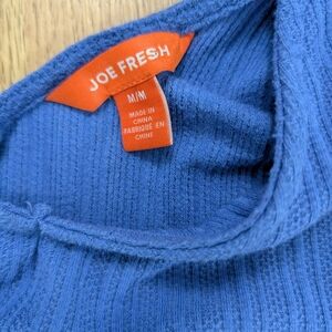 This vibrant blue blouse from Joe Fresh features a relaxed fit with elegant ruffled details along the shoulders. The sleeveless design and soft fabric make it perfect for casual outings or a day at the office.