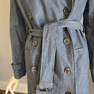 Joe Fresh Denim Trench Double breasted with belt Size medium 99% cotton 1 % spandex. Navy blue lining wi89th two small inner pockets.