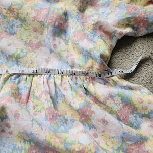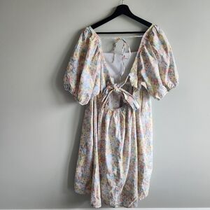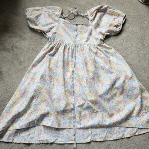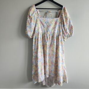 Charming floral dress with pastel hues. Features puff sleeves and a square neckline. Perfect for a casual outing.