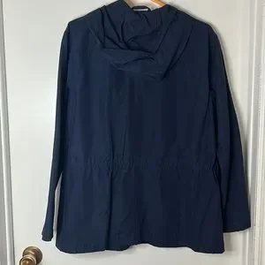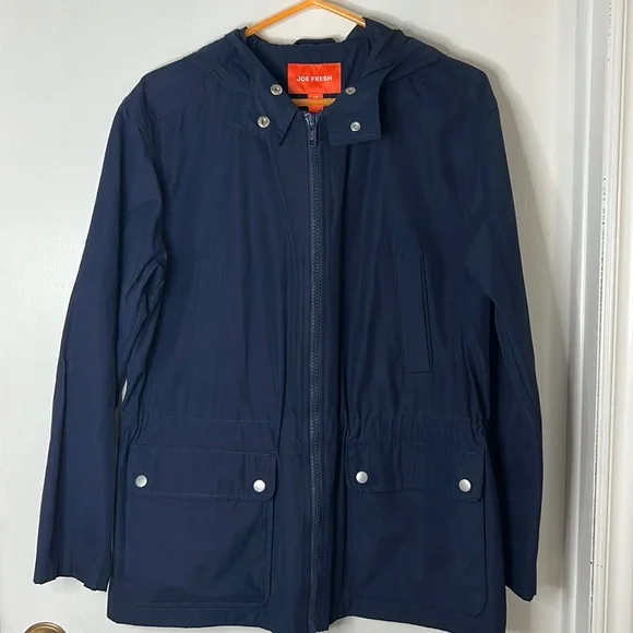 This Joe Fresh women’s jacket is a light weight coat that is perfect for spring or fall. It is in excellent condition. Only worn a couple of times. It has a hood on the back. It zips up the front and also has two buttons at the top to secure the hood. It has two front pockets as well as two breast pockets. This jacket is a beautiful navy blue.