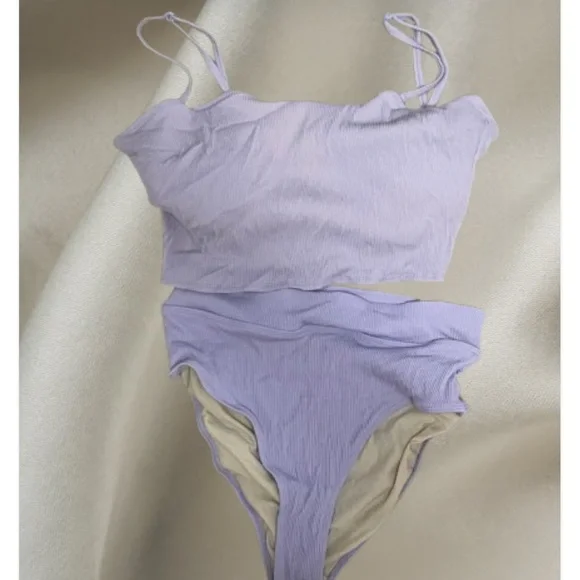 Lilac ribbed bikini top with thin straps. Matching lilac ribbed bottoms. Textured stretch fabric for comfortable fit.