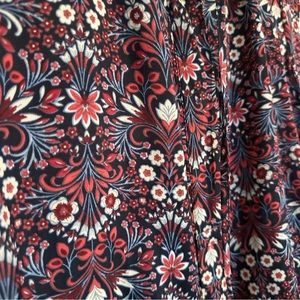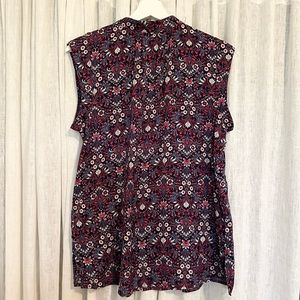 Flowy paisley blouse with red, blue, white & purple tones. Small v-neck with bow to tie blouse; can be left undone for a more open v-neck look.