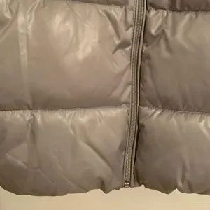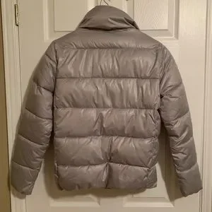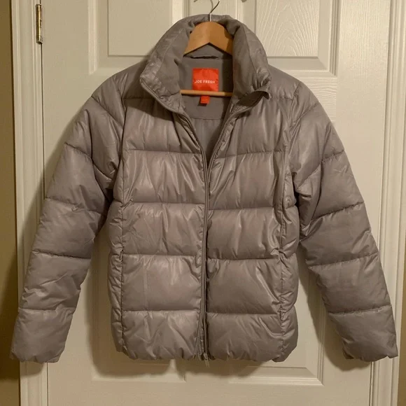 Joe Fresh puffer jacket. Silver. Size XS. Worn a handful of times. Slight imperfection near front zipper — visible in photo 4 and 5.