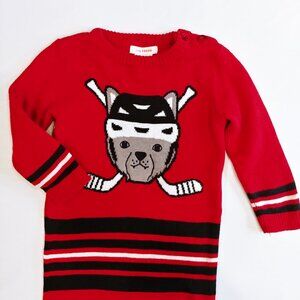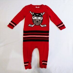 The one-piece knitted jumpsuit has a dog's face wearing a hockey helmet with two crossed hockey sticks behind the dog's head. The jumpsuit has black and white stripes on the sleeves, cuffs and around the waist. There are button closures on one shoulder and along the inseam. Soft 100% cotton knit. Excellent condition