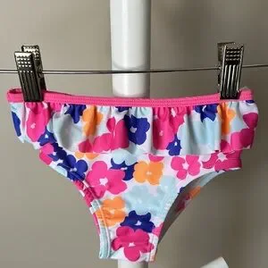 Very good used condition Joe Fresh ruffle bikini size 2. Top has ruffles on front and cross cross straps at back. Bottoms have ruffle around waistband. Bright and colourful floral pattern is perfect for the pool! Light wear on bum.