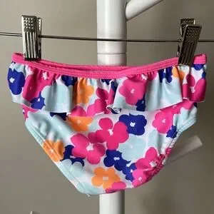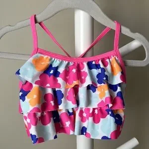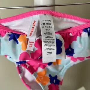 Very good used condition Joe Fresh ruffle bikini size 2. Top has ruffles on front and cross cross straps at back. Bottoms have ruffle around waistband. Bright and colourful floral pattern is perfect for the pool! Light wear on bum.