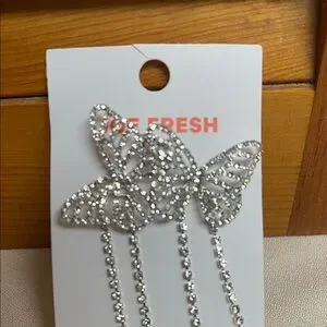 Sparkling butterfly motif with rhinestone detailing. Three dangling rhinestone chains add movement. Lightweight and eye-catching. Perfect for dressy occasions. Dangle is removable to just wear butterflies! Worn either way, perfect for prom, weddings, formal occasions and butterfly enthusiasts! Brand New. Never worn.