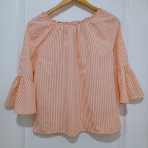 Lovely loose fitting Joe Fresh top with three quarter length bell-shaped statement sleeve. White pin stripe embroidery detail on the fabric and tie front.