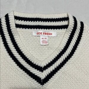 Classic v-neck sweater vest by Joe Fresh. Features a textured white base with black trim. Ideal for layering.