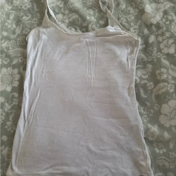 Elevate your wardrobe with this classic white ribbed tank top. Perfect for layering or wearing on its own, this versatile piece is a must-have for any closet. Slight discolouration under the arms.