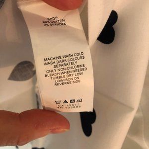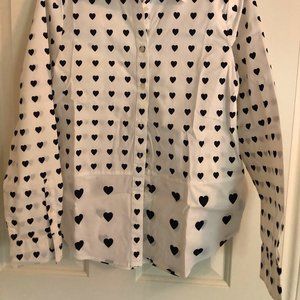 Adorable white button down shirt with navy blue hearts from Joe Fresh. Size Small. 98% cotton, 2% spandex. New condition. Never worn. No tags. 2 different sized heart patterns - smaller hearts on the top, larger hearts near the hem. Curved hem. Centre back pleat. Measurements as follows: Armpit to armpit across (lying flat): 18.5"; Length from top button to hem: 24"