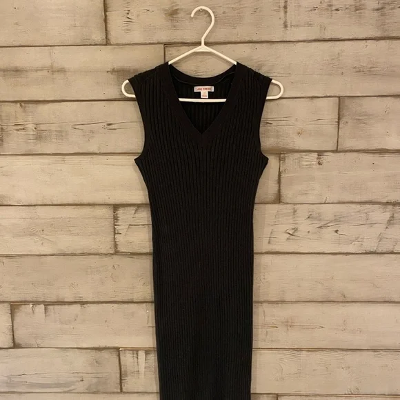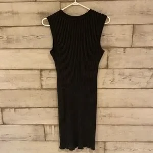 Chic black midi dress with ribbed texture. Sleeveless design. Perfect for versatile styling.