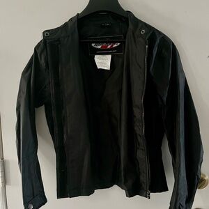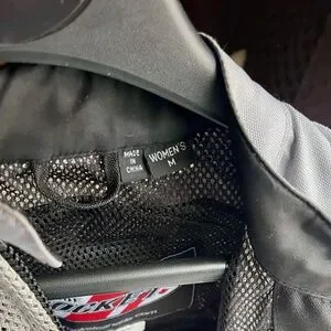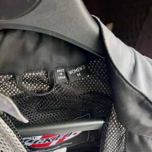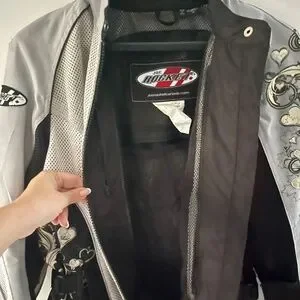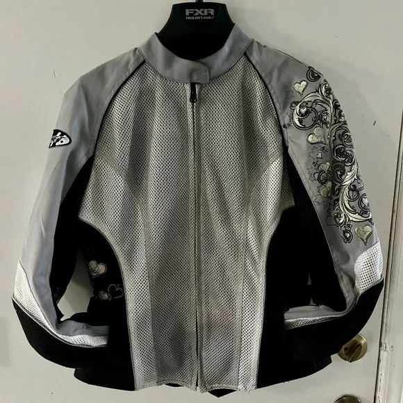 Joe Rocket wind resistant warm weather textile riding jacket. This jacket includes an inner lining that zips out, making the jacket wind resistant. Velcro straps at sides for an adjustable fit. Elasticized wrists on liner and snaps keep it in place. Outer jacket has pockets made to accommodate armour should you choose to add it. Left arm & right hip have a swirly design with hearts & silver thread to give an edgy yet feminine look. Light grey, black & white.