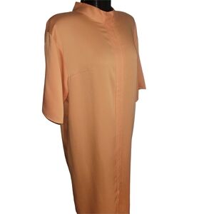 Stylish peachy orange colored maxi dress in a shift style design. Perfect for any occasion. Has a mock neck with double button keyhole closure at back neckline.