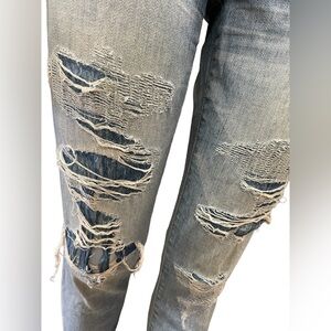 Joe’s distressed jeans!! Cotton blend denim light wash. These are size 24. Has good stretch to them- they look super comfortable:)