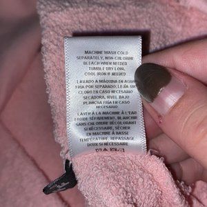 Size XS, relaxed fit can easily fit a small. Baby pink, is more pink then stock photo portrays. Rounded neck. Long sleeve with lace up detailing. Edges are distressed intentionally. Soft fabric, not fuzzy inside.