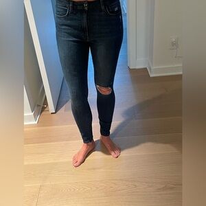 Comfy, stretchy skinny jeans in dark wash and torn knee detail.