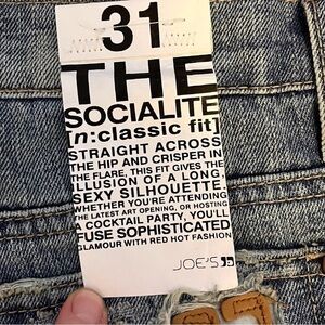 The Joe’s Jeans Socialite are a classic fit that stretches out your silhouette and give you legs for days. Nice rigid denim. Mid rise 8” rise. Straight across the hip and crisper into the flare. Some intentional distressing. New with tags.