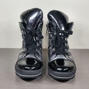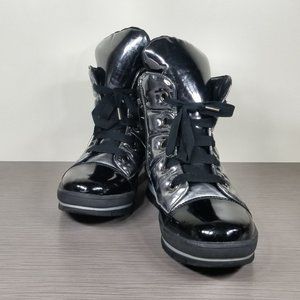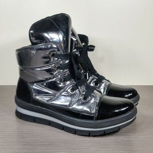 A scene-stealing sneaker boot is fashioned from channel-quilted polyurethane with a waterproof, shiny-metallic finish and styled with a padded collar and tongue, providing all-day warmth while you walk the city streets in style.