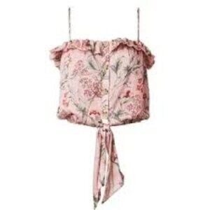 Excellent condition Johanna Ortiz X H&M pink spaghetti strap top, size M. Ruffle detail, front button down detail and tie hem. Elastic at the top and bottom.