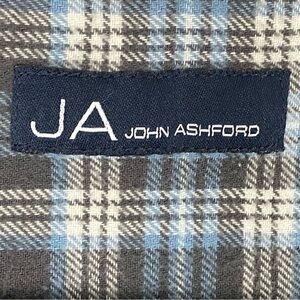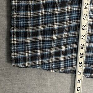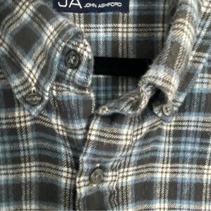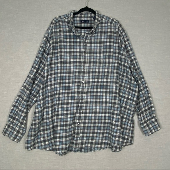 John Ashford flannel shirt. Men's Tag Size 4XLT. 100% cotton. Blue, black and white plaid. Button down collar. Long sleeve with single button adjustable cuffs.