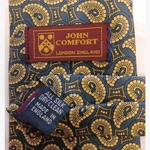 Made in England this tie is 100% silk. A rich golden paisley against black in color. This would make the perfect gift or great office wear.