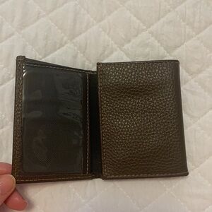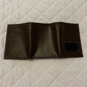 JOHN DEERE brown leather wallet, tri-fold wallet, five card slots and two bill slots, OS. One clear cover slot for ID, with 5 additional card slots. Small flaw on interior of the bill slots (as shown in picture)