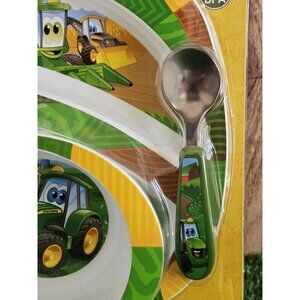 The set includes a divided plate, spoon, cup and bowl all featuring a John Deere tractor.