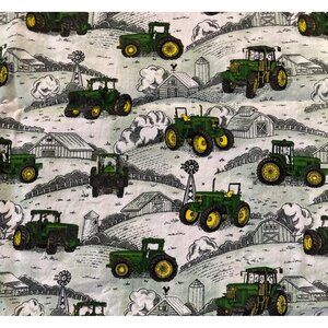 This fabric bundle features John Deere tractors on a scenic farm landscape. Ideal for quilting projects, upholstery, or crafts.