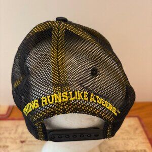 Selling a black and yellow John Deere hat. This is a trucker-style hat with a mesh back and a snapback closure, making it adjustable to fit most sizes. The classic John Deere logo is embroidered on the front. It is in great condition and ready for a new owner.