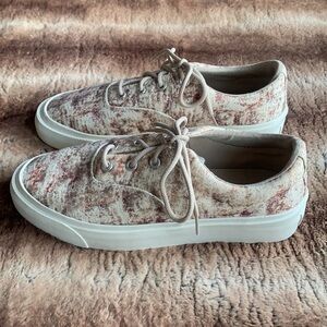 "Low-top canvas sneakers in tones of beige. Round toe. Tonal lace-up closure. Textile logo patch in off-white at tongue. Padded collar. Treaded rubber midsole in off-white featuring logo stamped in black at heel. Tonal treaded rubber sole. Silver-tone hardware."