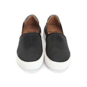 Stylish black slip-on athletic shoes. Textured upper with white sole. Comfortable and versatile.