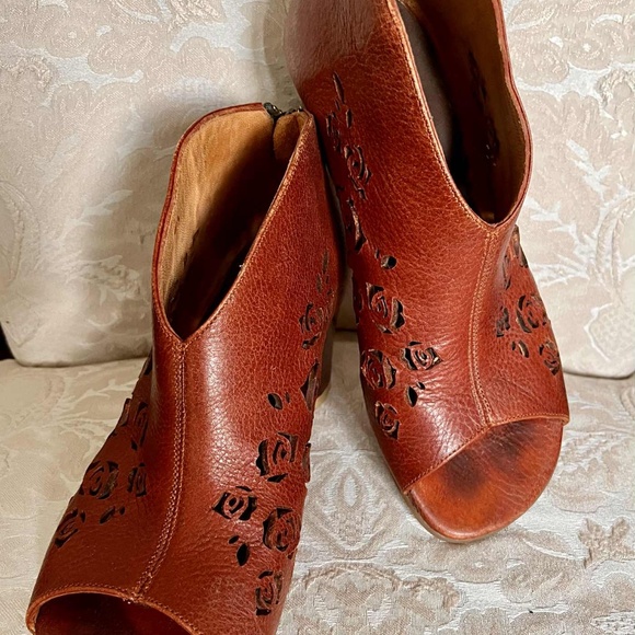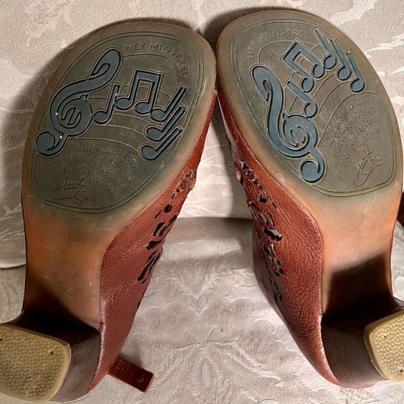 John Fluevog Brown Leather Cutout Heels – Floral & Music Note Detail, Size 6