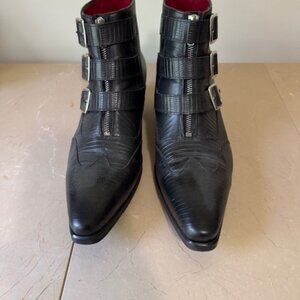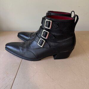Selling my near-new pair of John Fluevog Idol Jack boots, worn only once and in perfect condition. These bold, rockstar-inspired boots feature the original red lining, center front zipper, and a dramatic triple-strap design — unmistakably Fluevog.