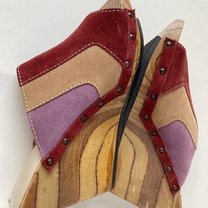 From avant guard Canadian shoe designer, John Fluevog, these are uber-stylish vintage clogs in very good condition. They are size 7, with a wooden wedge base, and multi-coloured suede (mauve , beige and burgundy) upper.