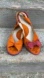 Fluevog PinUps Miss June. Size 11. Suede leather. Great used condition. Some heel rub marks. A suede brush may remove those. There are removable bows. Peep toe. Slingback. Wedge. Scalloped. Orange and a raspberry red colour.