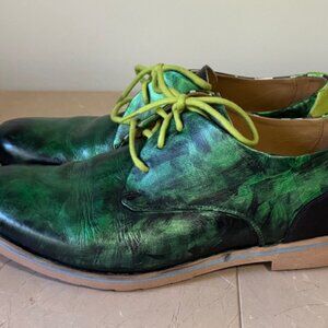 Selling a one-of-a-kind pair of John Fluevog Radio Kenn shoes in Men’s Size 11, hand-dyed by me in a vibrant green swirl effect using Angelus leather paint. The result is a bold, electric look that you won’t find in anywhere — truly a unique creation.