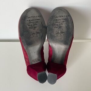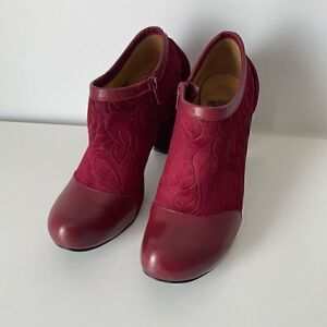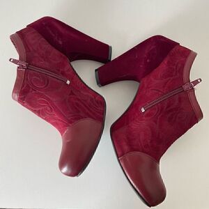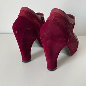 John Fluevog Red Booties Size 7 Burgundy Embossed Suede Velvet Heels Balthazar