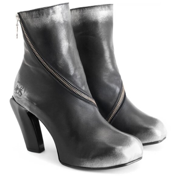 Crafted from specialty leathers with a spiral zip and custom designed curved heel, they feature an ultra unique, primal toe shape John first developed in the 90’s.