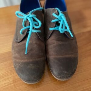 Fluevog Radio derbys with bright blue interiors. Leather has slightly distressed look.
