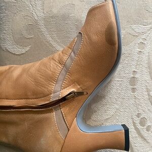 John Fluvog ‘Miracles Besthsaida’ ankle boots in soft tan leather. In good pre-loved condition. Beautiful cutouts and open toed. There are some slight scuffs at the heel (they came that way) and when I queried this at the JFV store they said it could be buffed out.