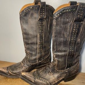 These Stampede boots almost look like a brushed leather, dark brown with some lighter streaks on the surface. They also have studding patterns.