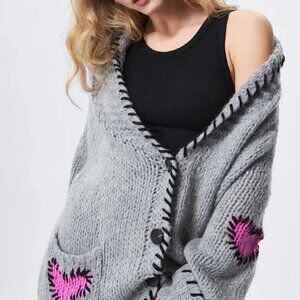 Stylish gray knit sweater. Features a textured design. Heart print. Super soft.