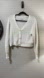 Chic white cardigan with a textured knit. Features colorful button accents. Ideal for layering.