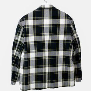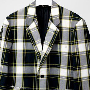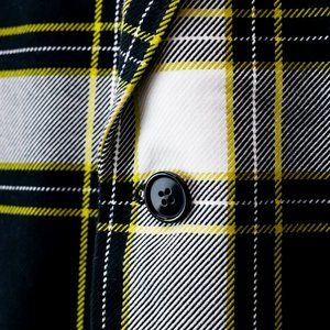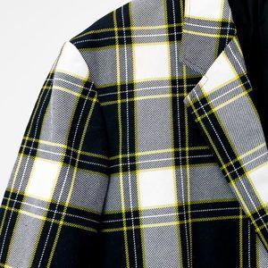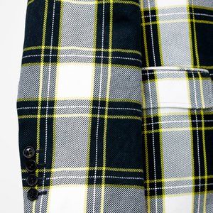 This heavy twill jacket from John Lawrence Sullivan flaunts a classic black and white tartan print with yellow details, notched lapels, two front flap pockets, and a welted breast pocket. Partially lined with black satin, this contemporary jacket is a must-have fall transition piece.