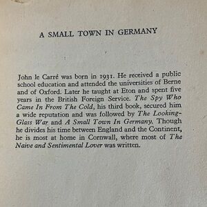AI description: Discover the intrigue of 'A Small Town in Germany' by John Le Carré. This book, with its classic cream cover, is a perfect addition to your coffee table collection.