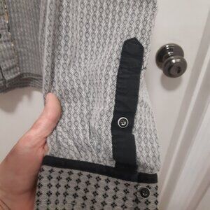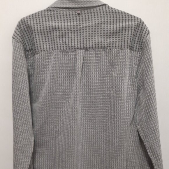 Pit to Pit is 22 inches; Length from shoulder to front hem is 26 inches; gray pattern;