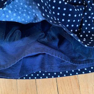 Adorable John Lewis smoked dress. Vintage style - like we wore in the 80s. Navy blue with white polka dots and red smocking. Corduroy material. Has a crinoline. Sized 12m - 18m.