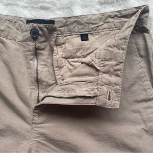 In like-new condition; cotton/linen blend flat front shorts from John Varvatos USA. 9" inseam. Button and zip closure. Side slant pockets. Spare buttons attached.